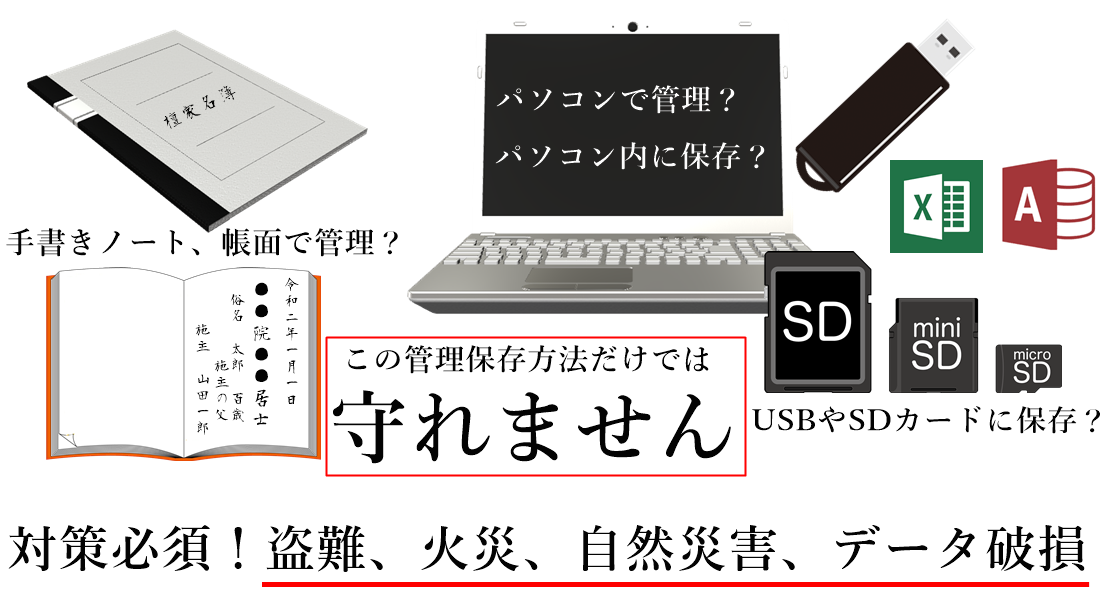 私たちスタッフはそう教えられてきました。それだけ過去帳は大事なお寺の財産です。帳面管理だと、その檀家名簿や過去帳が盗まれたら大変、火事や天災で消失したらこれも問題。やはり確実なデータ管理が必要です。紙媒体、帳面での管理ではなく、パソコン管理、USB管理だから安心と思われている方が一番危ないと言い切れます。PCもUSB外部メモリーも絶対ではありません。そうなるとデータを外部に保存することが万が一を避けることができるのです。歴史が刻まれた過去帳を未来に残すのであれば消えないデータ管理をおすすめするということです。もちろん、100%安心できる確かな管理法要など世の中にはありません。しかしながら、寺院内のみに保管しているよりも、消滅のリスクは少なくなることは確実です。紙媒体とクラウド型管理のダブル管理についてお考えください。