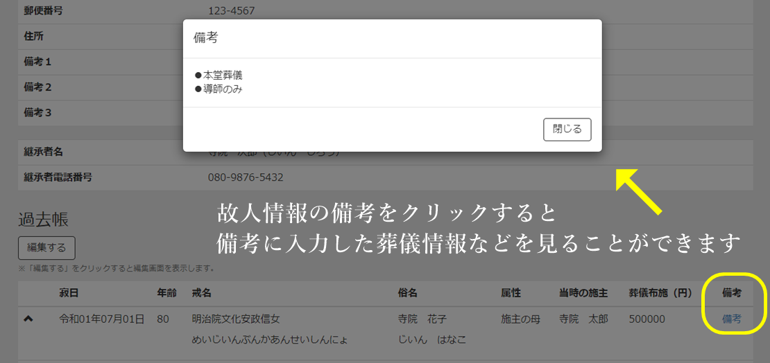 ※備考欄には、葬儀場所情報や、役僧情報など入力している寺院が多くございます。その他、死因や家族親族トラブルなどのメモにもご利用いただけます。